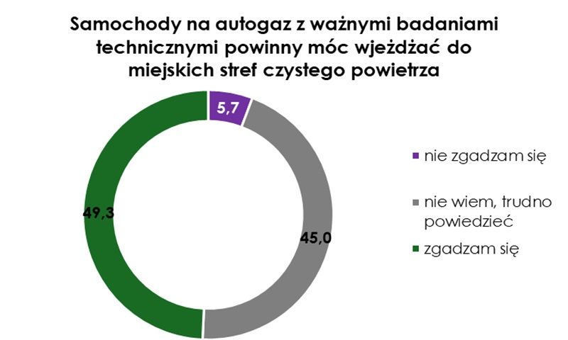 Wobec trwającej dyskusji o Strefach Czystego Transportu (SCT), zadano Polakom pytanie, czy ich zdaniem zasilane LPG samochody z ważnymi badaniami technicznymi powinny móc wjeżdżać do takich stref. Aż 49,3% respondentów udzieliło odpowiedzi pozytywnej, a 5,7% – negatywnej.