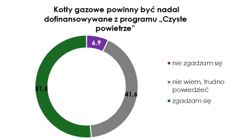 Wielkim rozczarowaniem dla Polaków było wyłączenie kotłów gazowych z programu Czyste Powietrze. 51,5% respondentów uważa, że kotły gazowe powinny być nadal dofinansowywane ze środków publicznych – na wsiach takich wskazań jest jeszcze więcej, aż 54,3%. Tylko 6,9% Polaków popiera wycofanie wsparcia finansowego dla kotłów gazowych.